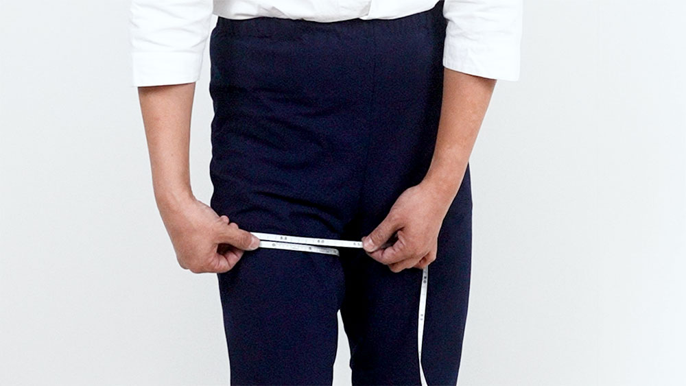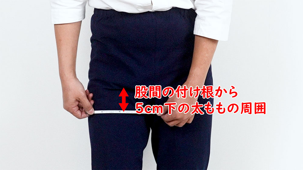 太ももの周囲の長さは股間の付け根から5cm下の部分をメジャーで測ってください。