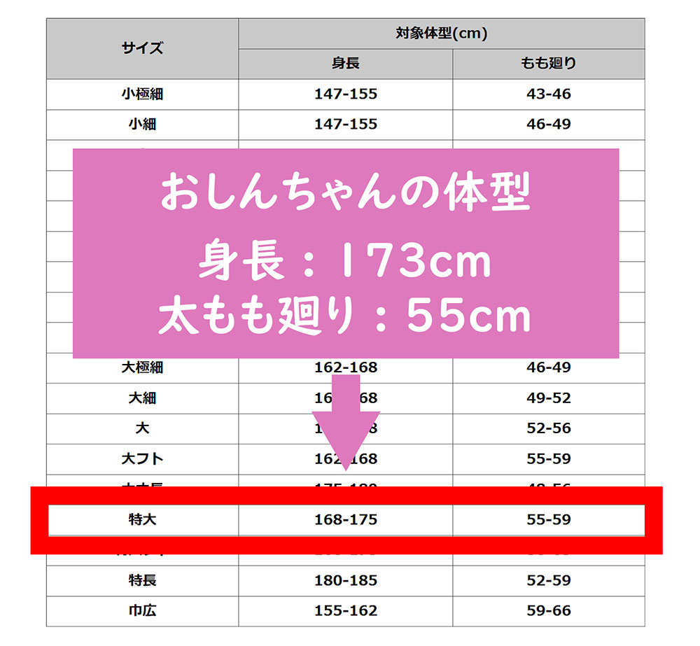 具体的なサイズで説明すると、小極細というサイズは基本となる小よりも脚周り全体的にかなり細いという意味になります。中細は基本となる中サイズよりも脚周りが全体的に細いという意味になります。大フトは基本となる大サイズよりも脚周りが全体的に太目という意味になります。そして、特大丈長(特長)は基本となる特大サイズよりも丈の長さが長いという意味になります。