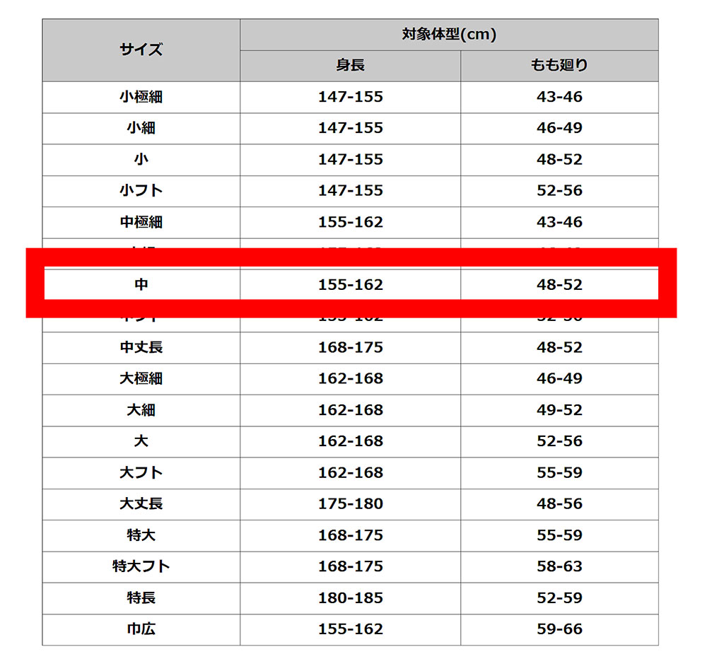 でも、中サイズって身長が155cm~162cm、太もも廻りの太さが48cm~52cmの体型の人向きのサイズじゃないの???