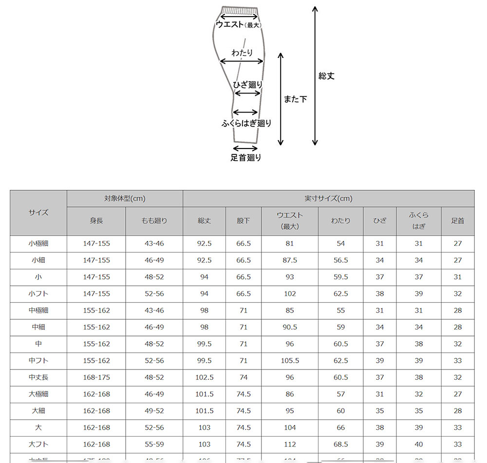 実寸サイズ表には、太もも周り寸法だけではなく、ウエスト、お尻、ふくらはぎ、足首、総丈、そして股下の長さも記載されています。